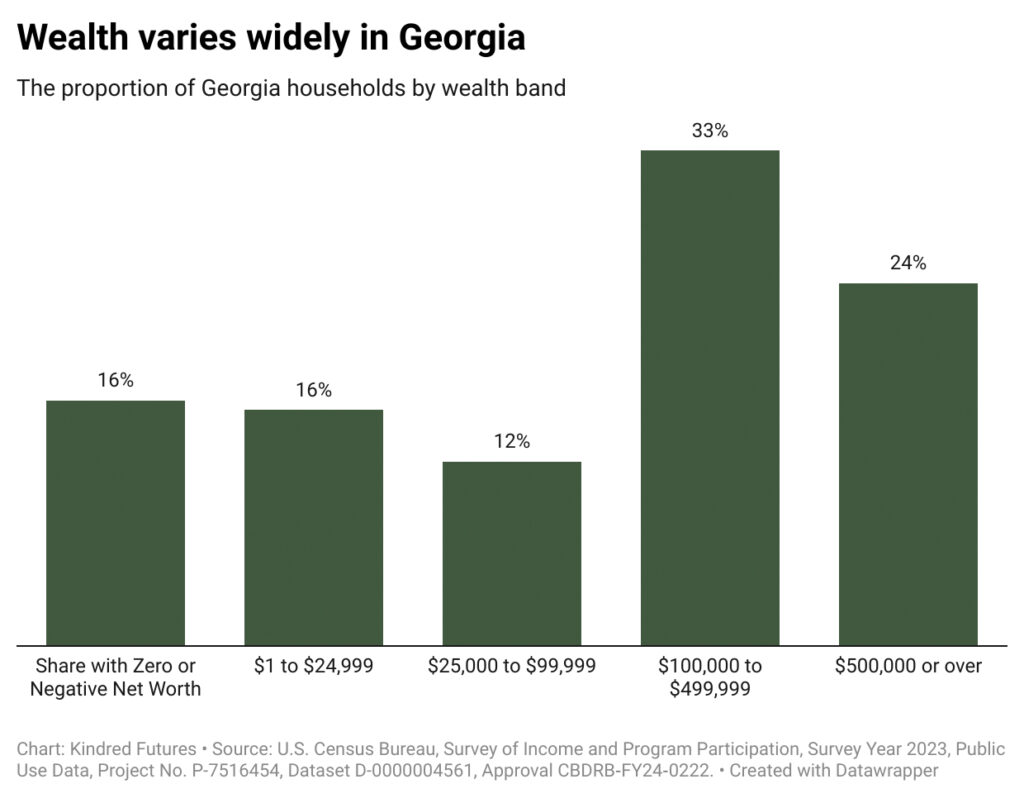 By many measures, Georgia’s economy is dynamic — yet the benefits are unevenly distributed. The median net worth of Georgia households is $166,300, ranking 26th out of the 45 states that have sufficient-enough data to report household wealth estimates.21 However, this single figure masks huge variations. For instance, 16 percent of Georgia households have zero or negative net worth, which means they have no resources to fall back on in the event of a financial emergency.