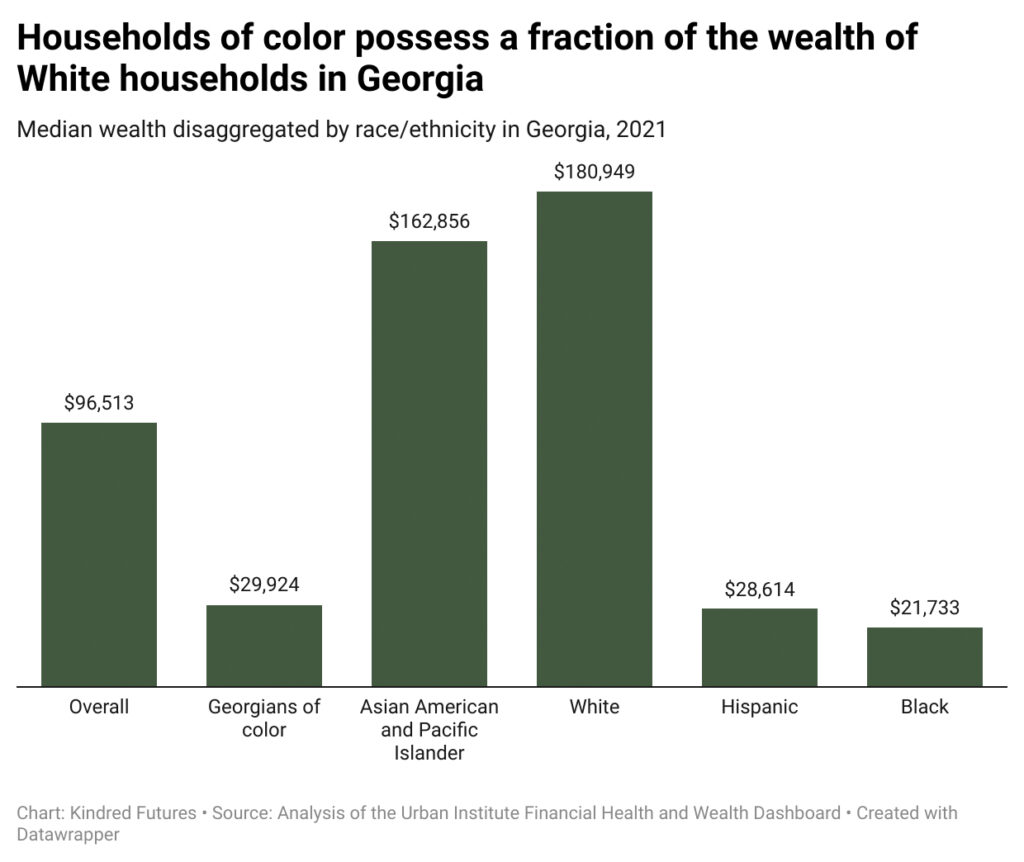 There is also geographic and racial inequality within Georgia – an inequality that is even more pronounced when looking at wealth. Statewide, White families are far more likely to own homes, businesses, and retirement accounts, whereas Black and Latinx families are overrepresented among the asset-poor, which contributes to a widening racial wealth divide.22 This means many families of color in Georgia have little beyond paycheck-to-paycheck income – few reserves to draw on for college tuition, a down payment, or an emergency expense.