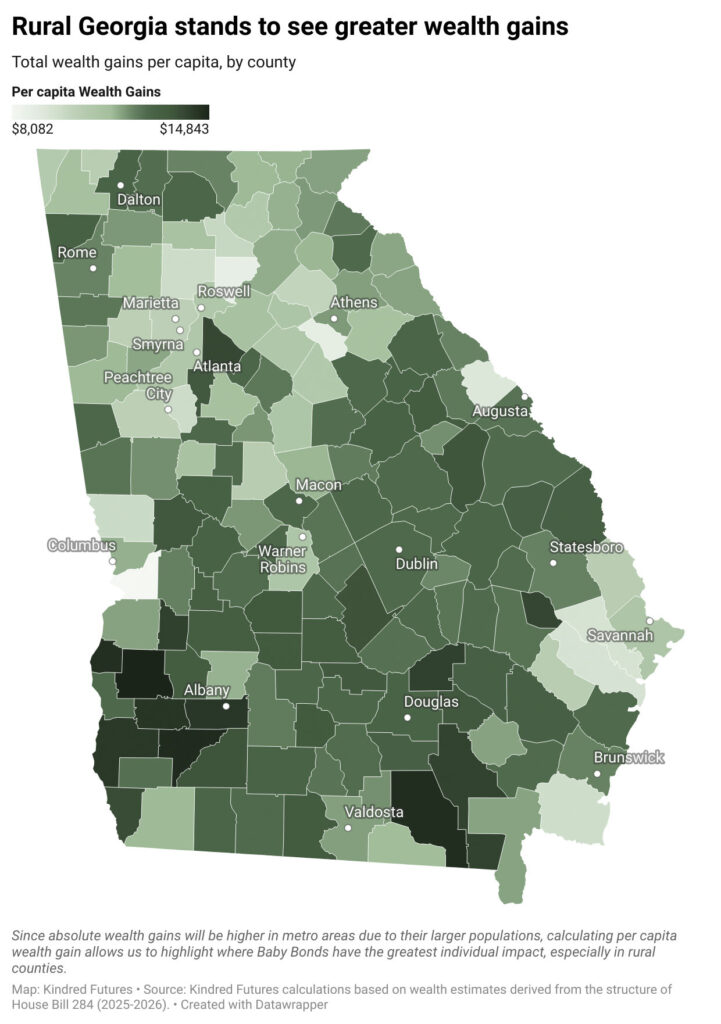 The map illustrates the projected per capita wealth gains for newborns in Georgia under House Bill 284, showing how Baby Bonds have the greatest relative impact in rural counties. While absolute wealth accumulation is higher in Metro Atlanta due to larger populations, this per capita analysis highlights where each child stands to benefit the most. The darker-shaded counties, concentrated in South and Central Georgia, reflect areas where a higher proportion of newborns qualify for the larger $15,000 baby bonds contribution, leading to greater wealth-building potential. In contrast, lighter-shaded counties, primarily in affluent suburban and metro areas, have lower per-child wealth gains due to a smaller share of low-income births. This visualization reinforces how baby bonds can help close wealth disparities between rural and urban communities, ensuring that children born in Georgia’s lowest-income counties have: stronger financial foundation by adulthood.