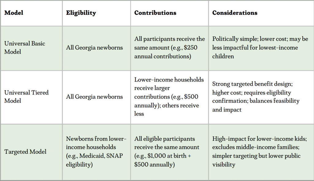 In evaluating the available baby bonds models for Georgia, we recommend a hybrid approach that combines universal eligibility with income-based tiered contributions, as proposed in GA House Bill 284.