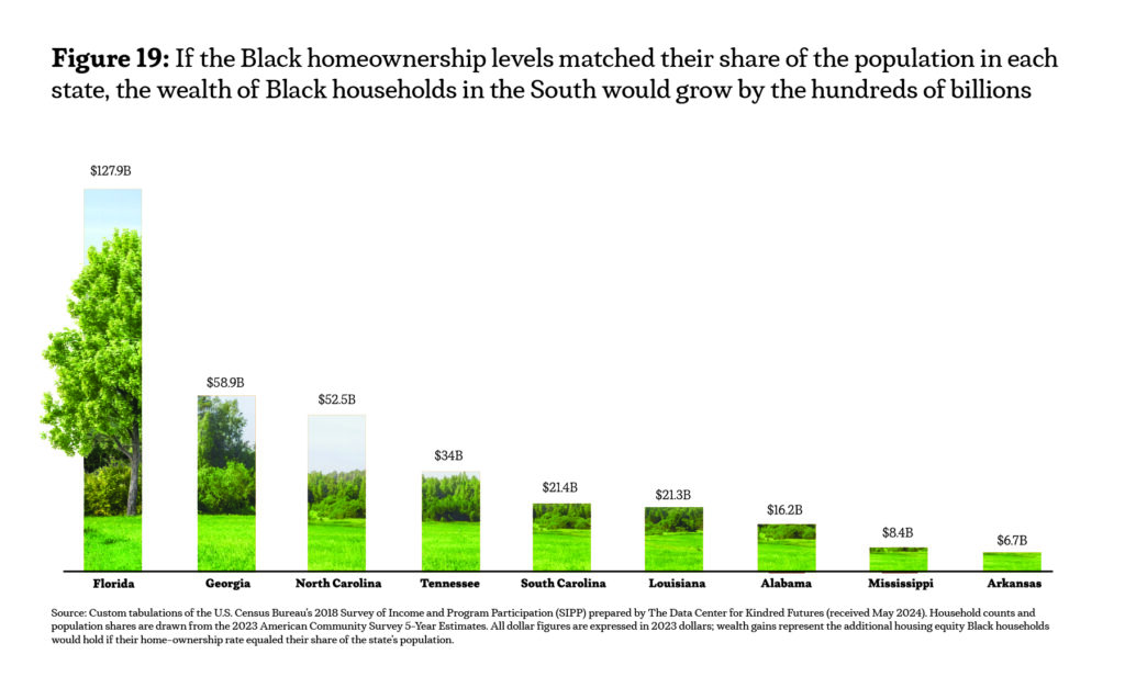 If these measures are implemented, we could see Black homeownership in the South rise significantly over the next decade – potentially closing the homeownership rate divide by several points. In addition, more equitable home values would increase Black wealth directly. Our analysis indicates that if Black homeownership rates were aligned with their population share, there would be a significant infusion of housing wealth into Black communities. Using state-level data on total owner-occupied units, current Black homeownership figures, and median Black home values, we determined the target number of Black homeowners that would reflect their demographic presence. For example, in Alabama, the divide suggests that an additional 108,250 Black households could become homeowners, potentially adding around $16.24 billion in housing wealth. In Florida, closing this divide could contribute an estimated $127.85 billion in additional housing wealth.